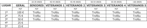 Os prémios monetários individuais serão atribuídos aos participantes da classificação Geral Masculina e Feminina. Seniores Masculino e Feminino e, Veteranos 1, 2, 3, 4 e 5, Masculinos e Femininos, atribuição de troféu.